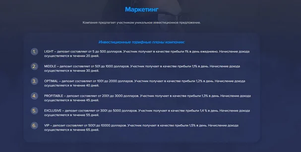 Вкладчикам на Crypto Invest предлагаются несколько тарифов с возвратом изначально вложенной суммы в конце срока. Начальный тариф Light предполагает прибыль 1% в день, сумму вложений от 5$ до 500$ на срок 20 дней. К примеру, вложив 10$, через 20 дней можно будет вывести 12$. Остальные тарифы рассчитаны на сроки от 30 до 45 дней и суммы от 501$, процент прибыли по ним выше. Вряд ли они будут востребованы среди пользователей: не каждый готов вкладывать подобные суммы, да еще и на длительный срок.