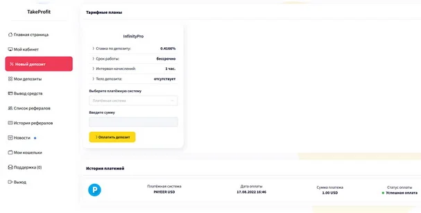 Проект TakeProfit является хайпом, или финансовой пирамидой. Это говорит об очень высоком риске вложений. В интернете есть масса примеров, когда подобные сайты внезапно прекращали платить, и вкладчики оставались ни с чем. Наш обзор ни в коем случае не несет рекомендационный характер, это только информационный материал.